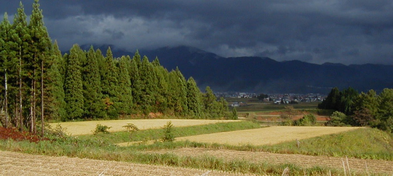| 平成13年10月13日(土)天候(雨時々青空そして虹) 刈り取りを待つ田んぼ(さわのはな) 肉眼では金色に見えたのですが |